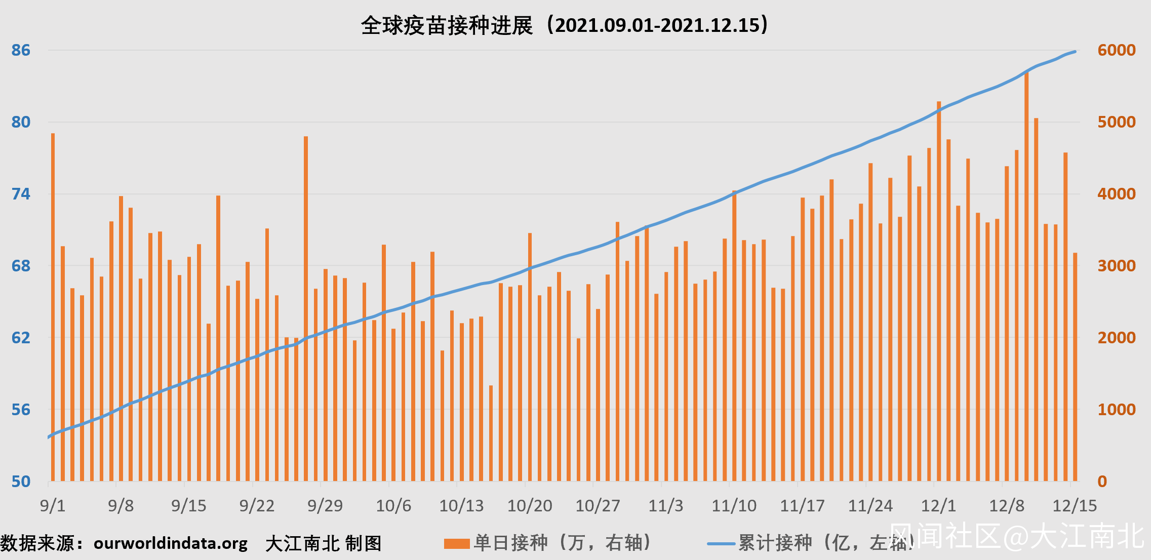 截止2021年12月15日,全球累計接種新冠疫苗85.85億劑;其中單日接種3182萬劑;平均每百人接種109.02劑,環比增加0.32劑。