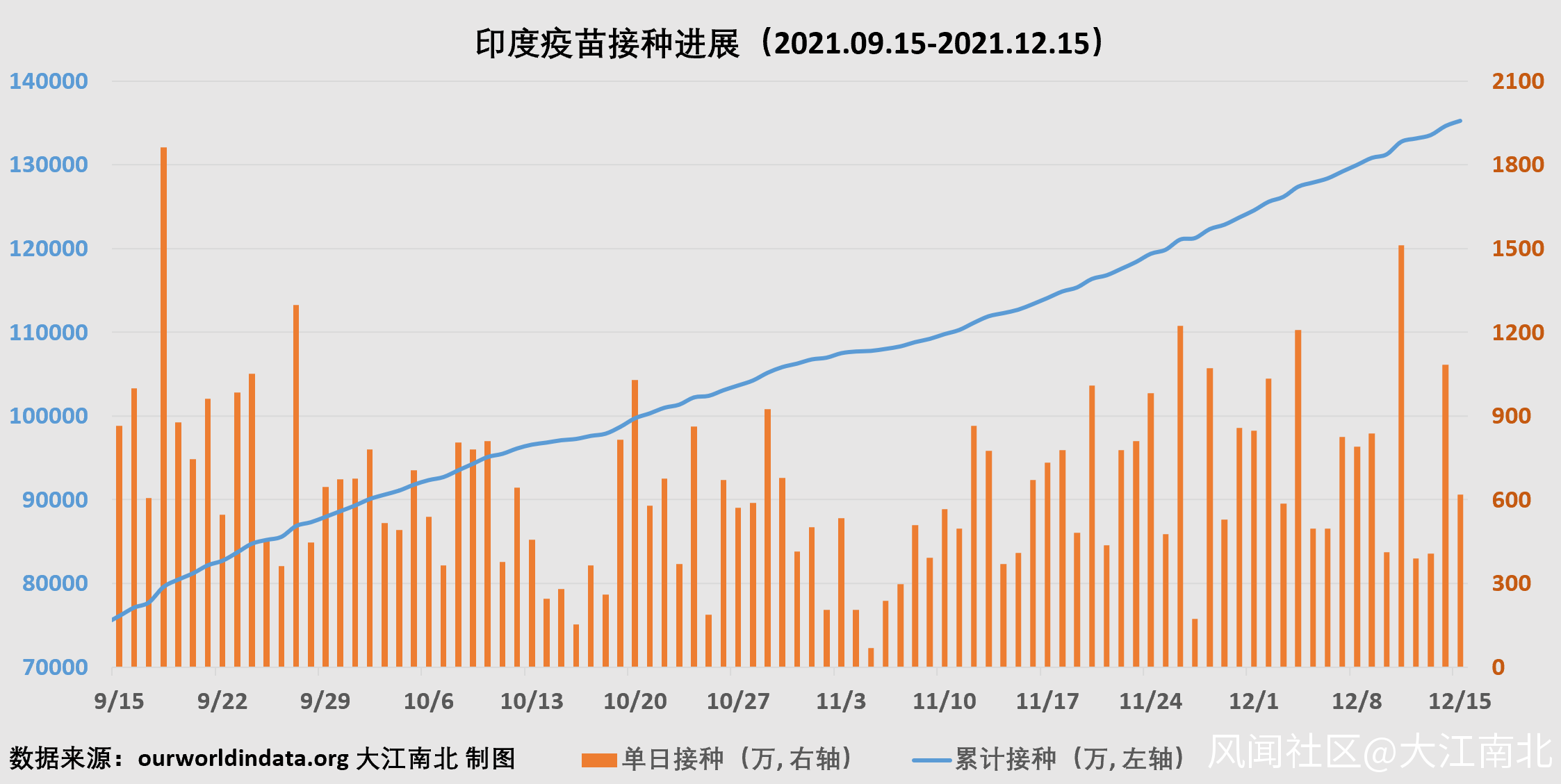 截止2021年12月15日,印度累計接種13.5259****億劑,列第二位,**其中單日新增接種619萬劑。**印度每百人累計接種97.06劑,是中國的51.9%。