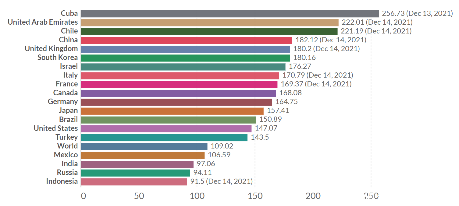 世界主要大國**+**部分小國每百人接種劑次(2021.12.15)