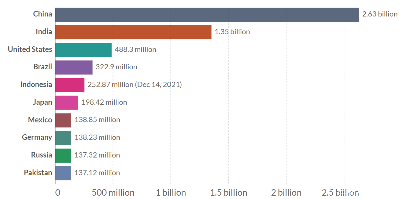 截止2021年12月15日,**中國大陸累計接種新冠疫苗26.4006億劑,**繼續位居全球第一位,佔全球累計接種劑數的31.0%;其中單日新增接種986萬劑,佔全球單日接種劑數的21.0%。隨着各地加強針接種的開展,國內接種劑數保持高位。中國每百人累計接種187.00劑,環比增加0.70劑,是美國的1.29倍,位居世界主要大國之首。