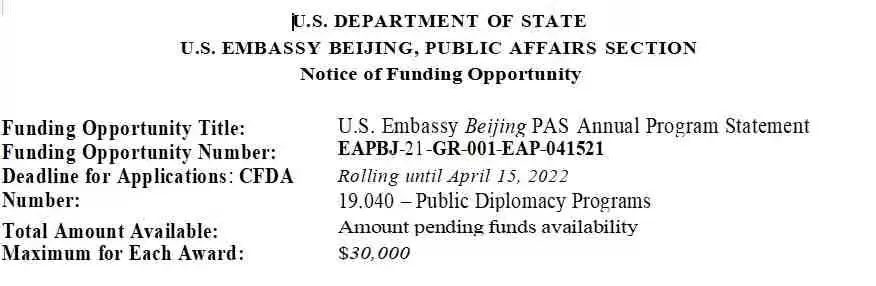 今年5月,美國駐華大使館和領事館,在其官網上推出2021年度“公共外交小額贈款計劃”,擬用於資助中國境內的個人、非政府組織、智庫、學術機構等,舉辦宣介美國社會、歷史、文化藝術及價值觀的活動。