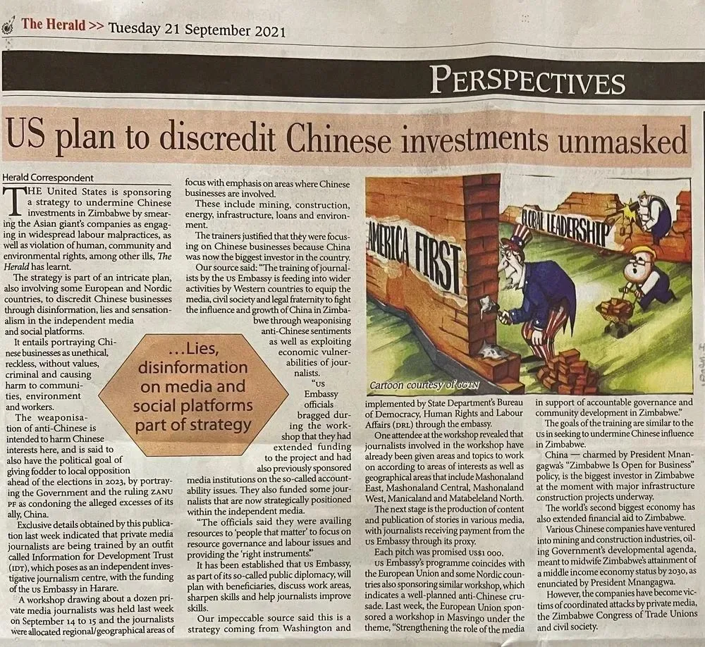 就在三個月前,津巴布韋媒體報道,美國政府通過其駐津使館,以資助相關機構舉辦研討會等形式,拉攏私營媒體記者,鼓勵他們採寫針對在津中資企業的負面報道,並提供每篇1000美元的資金支持。