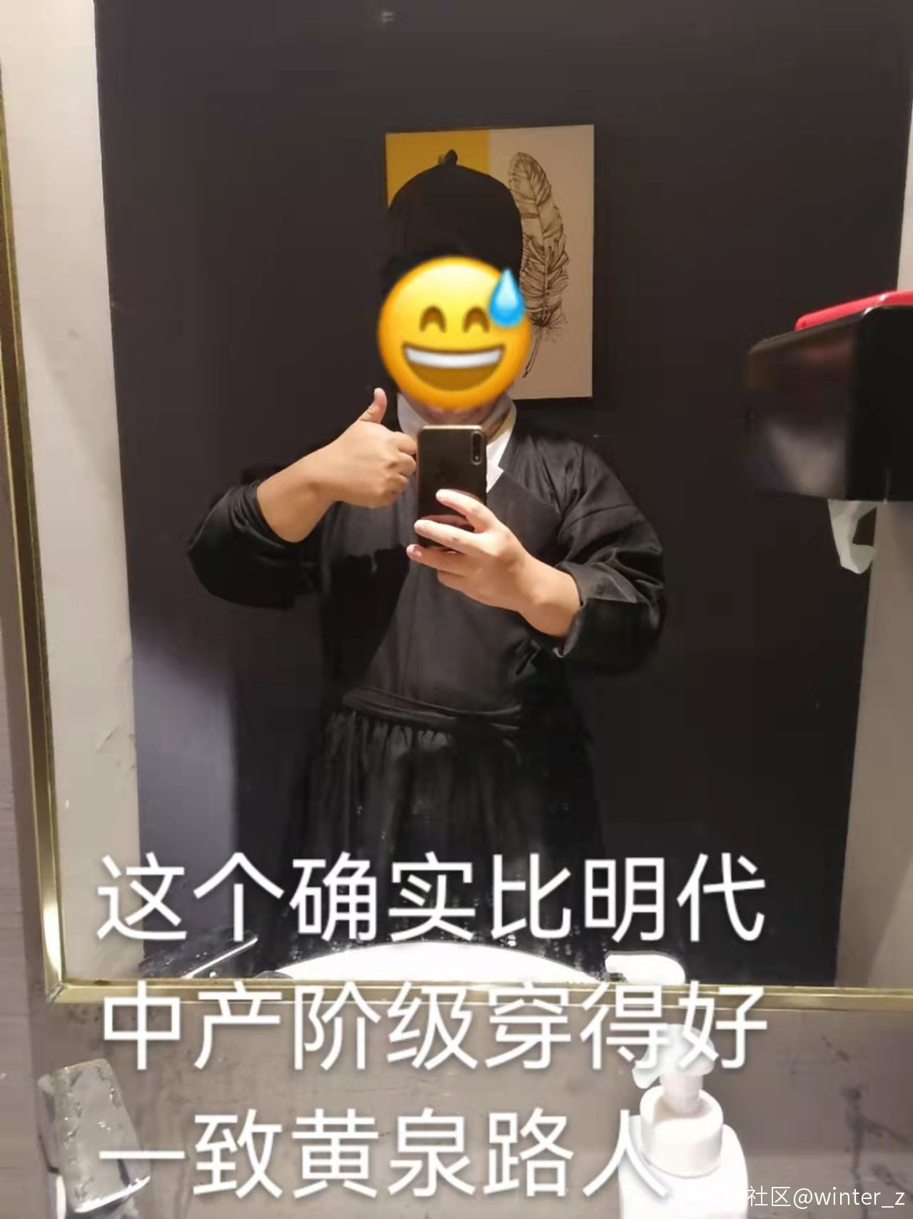 我們只是希望當我們正常想好好穿漢服的漢服愛好者們穿上漢服的時候,得來的不是謾罵和驚奇,更不是異樣的眼光。我穿唐缺胯袍,我穿明貼裏袍,我穿着明“直裰”袍,就是這些方便的,平民化的衣服,能夠和穿着衞衣運動褲運動鞋的人一樣不用享受外界的異樣目光。我們已經退讓了不知道多少了,然而到現在為止,正正經經穿漢服的人的處境,只能説改善了,但沒有完全改善。就更不要説什麼“沒人穿平民款”,“漢服是貴族穿的”。我上一篇小短篇已經辯駁了,然而很不幸被關進黑信息繭房了,我不在乎這一篇也被關進信息繭房。並且,我也不怕有些不長腦子的人,還沒看幾個字就開噴。