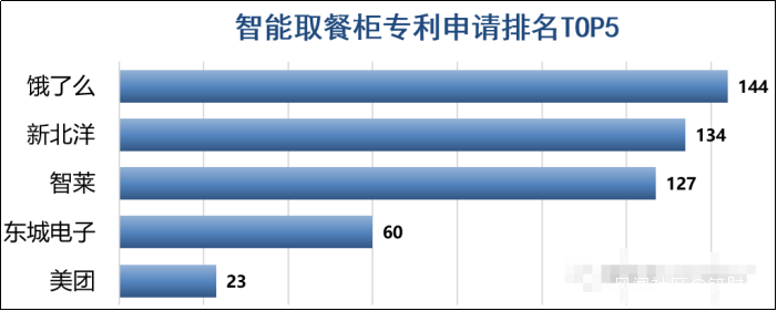 最新行業研究報告顯示,目前在取餐櫃領域專利數量排名前五的申請人依次是餓了麼、新北洋、智萊、東城電子以及美團。