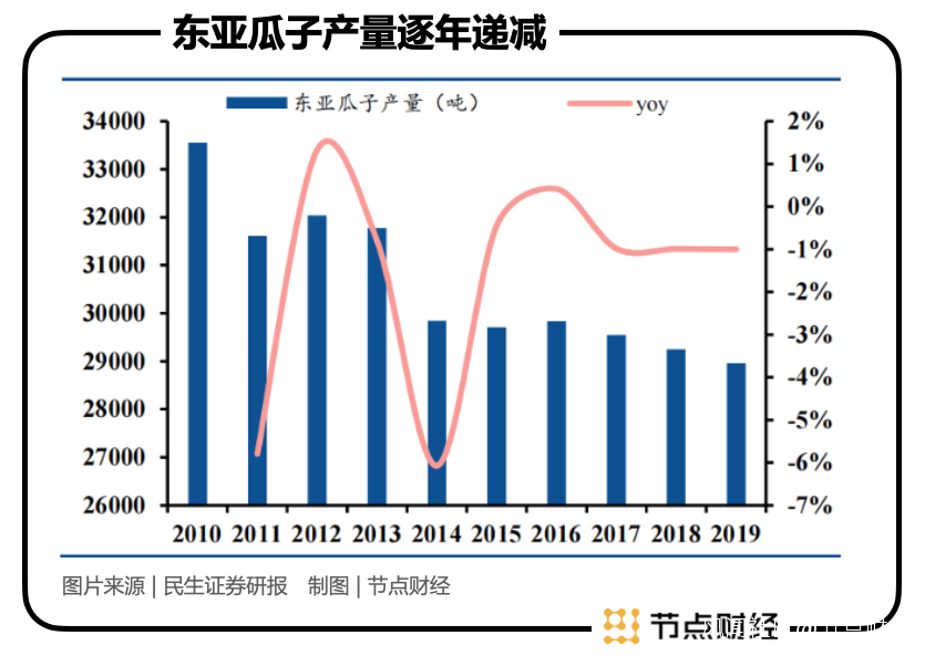 再者,從行業看,目前東亞瓜子產量進入下行階段,側面印證中國瓜子人均消費量遇到瓶頸。