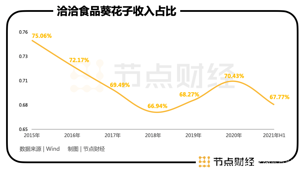 基於葵花子類產品收入佔比起伏不大,可見洽洽食品的基本盤保持穩固。但從增速數據看,2019年、2020年以及2021年上半年,洽洽葵花子類產品收入分別同比增長17.5%、12.8%、-4.3%,增長乏力跡象已表露在外。