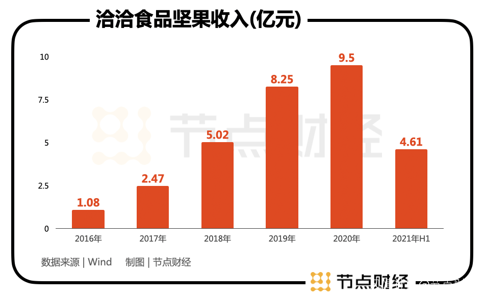 2018年-2020年,洽洽食品堅果類收入從5.02億元增長至9.5億元,年複合增長率37.6%,遠高於同期公司營收復合增速12.3%,營收佔比從11.97%提升至17.96%。2021年上半年為4.61億元,同比增速50.65%,佔比19.37%。