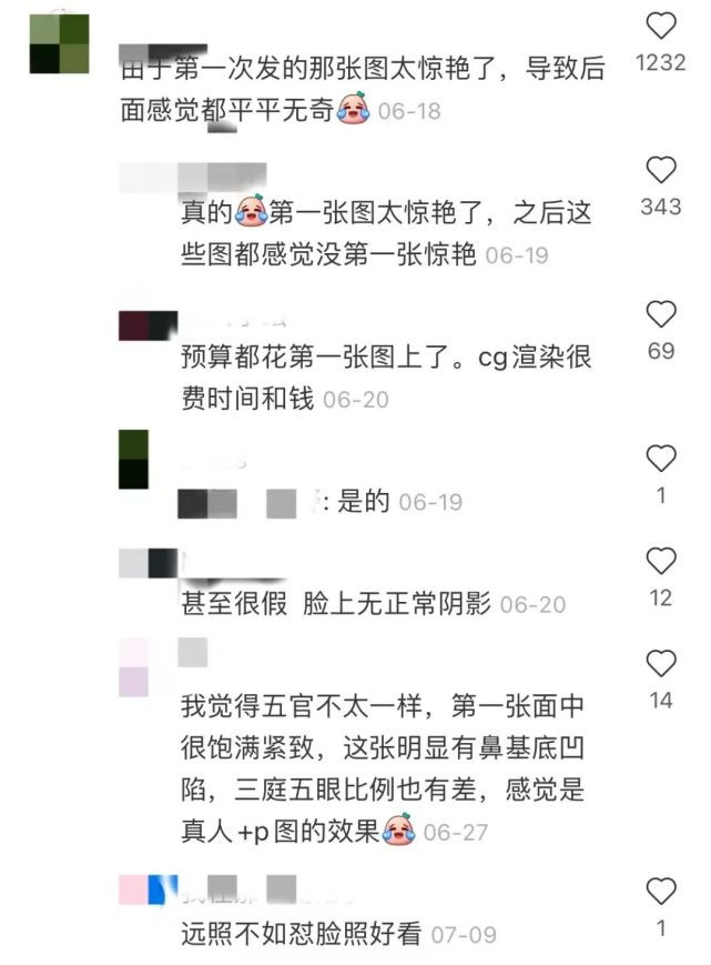 並且對於AYAYI發佈的圖片,在評論中有網友提出了種種質疑,“因為首次的圖片太驚豔,導致後面就覺得平平無奇了”,“甚至很假,臉上無正常陰影”……