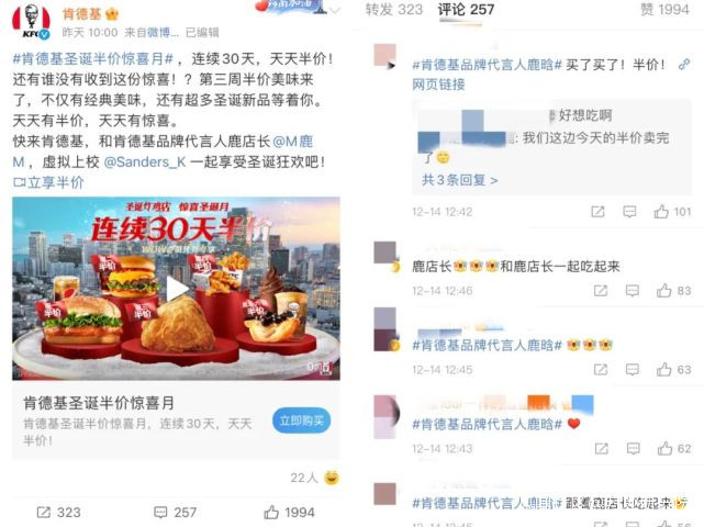 此外,在肯德基品牌官微發佈的內容,雖然同時提到了代言人鹿晗及上校,但評論中卻找不到任何關於這個虛擬IP的字眼。