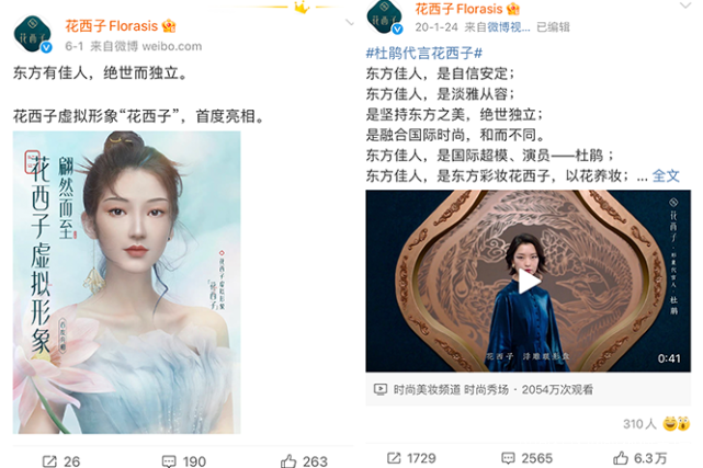 當時噱頭很足,在互聯網上掀起了一陣熱潮,但品牌官宣的微博互動卻非常少,點贊只是百位數,相比官宣代言人杜鵑時,數據差距非常大。而“花西子-東方佳人”賬户中,發博的互動量更在少數。