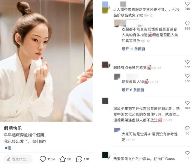 這條翎發佈的內容,讓網友們產生了很大的爭議:1.認為沒有真實體驗、消費過產品。像護膚品這類需要有人類真實體感的產品,AI人物帶貨是沒有參考性的;2.行為動作不符合人設。強調於熱愛國風文化、喜歡京劇、毛筆字和太極等傳統中國文化的跨次元女孩,帶貨的卻是Gucci。