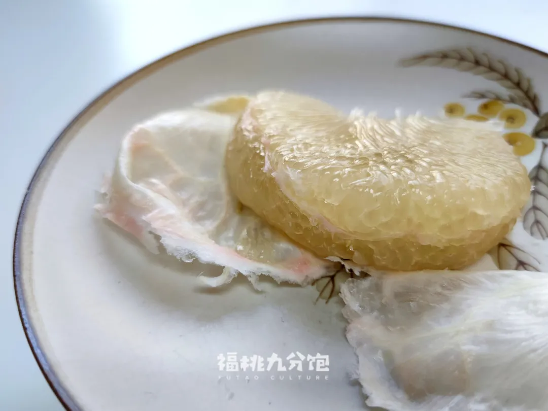 玉環文旦比較大且扁,但皮很厚,實際得到的果肉只有普通柚子的2/3大小。果核比較小,**內側的白筋很細並且只是依附在果肉表面,剝起來相當容易!**味道也酸甜適中,**能吃到柚子濃郁的本味。**但缺點就是長得比較扁平,並且皮附着得很緊,不容易完整剝離也不方便做造型。