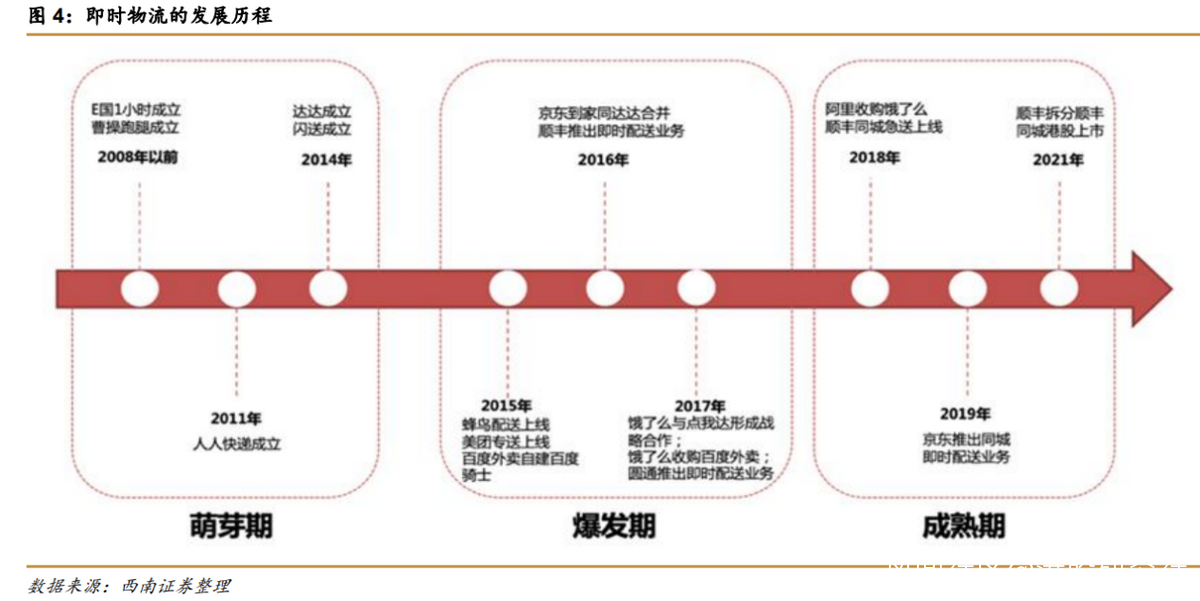 2009年,外賣平台陸續上線,即時配送開始在摸索中改進,但配送場景相對於侷限在餐飲外賣等領域。隨着以美團、餓了麼、百度外賣為首的“外賣大戰”展開,即時配送行業開始吸引到不同玩家的加入,2014年,閃送和達達上線;2015年UU跑腿上線;2016年順豐同城進場。