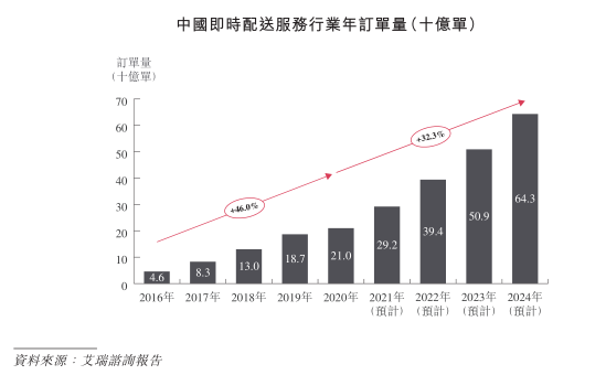 公開數據顯示,預計2024年中國實時配送服務行業的年訂單量將進一步增至643億單,2020年至2024年複合年增長率為32.3%,國內即時配送行業仍是一片藍海。
