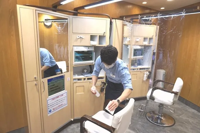 甚至連鏡子和櫃子的角度,都是規定好的139.68度,這樣能在理髮時,儘可能減少理髮師的移動次數。