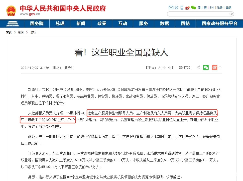 ▲10月27日,中國政府網發佈數據:在本期排行中,生產製造及有關人員與社會生產服務和生活服務人員兩個大類職業需求保持旺盛勢頭。圖/中國政府網截圖