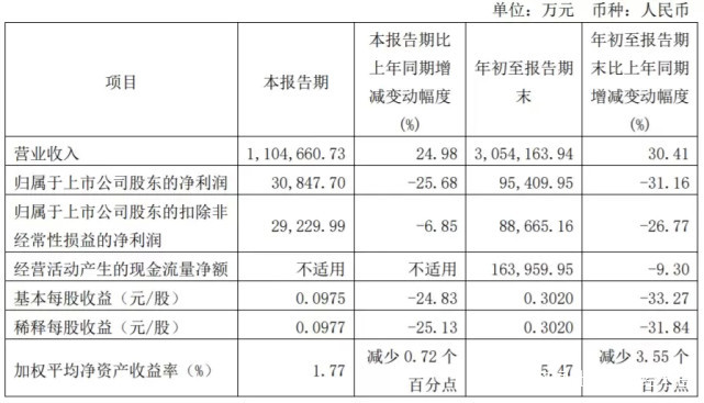 2021年前三季度,圓通速遞實現營業收入305.42億元,同比增長30.41%。但是,公司實現歸屬於上市公司股東的淨利潤9.54億元,同比減少31.16%。同時,公司經營活動產生的現金流量淨額8.57億元,同比下滑30.29%。