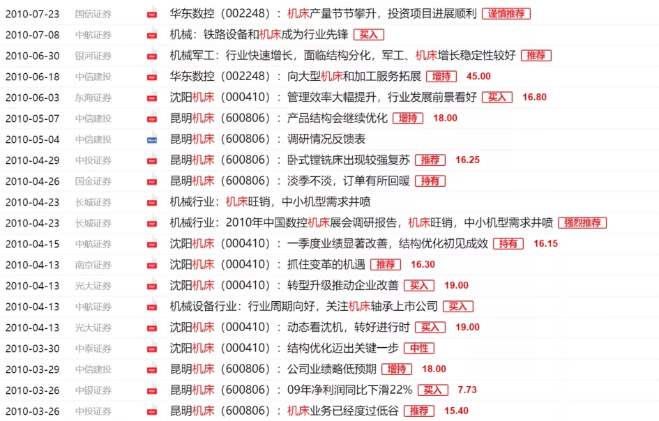 這是我們隨手在2010年截取的券商機械行業關於機牀的報告。