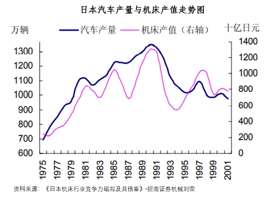 這是招商證券劉榮2009年的一篇報告中的圖,1971-1991年間,日本汽車產業從國內向海外轉移,也帶動了國外汽車生產基地對日本機牀的需求,巧合的是,1983年日本汽車產量超過美國成為第一,1982年日本機牀產值也躍居世界第一。