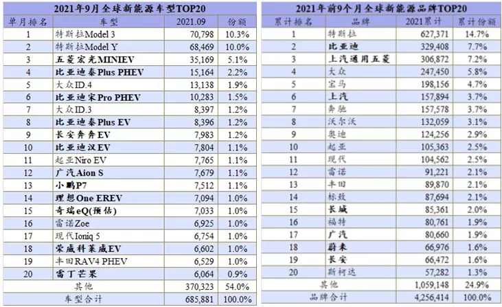 在2021年9月份全球新能源汽車車型銷量前20排行榜中,中國有12個,除了比亞迪系列外,還有你平時聽都沒聽過的雷丁芒果。哪怕按品牌計算,在全球前9個月的累計數據中,比亞迪也僅次於特斯拉排名第二。