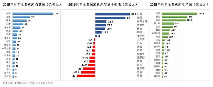 上圖是2019年世界各國機牀貿易情況。中國美國同為最大的機牀消費國,同時也是最大的貿易逆差國。最大的順差國分別是日本、德國。