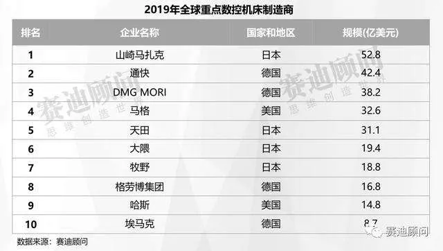 上圖是賽迪顧問2019年全球重點數控機牀規模表。最大的山崎馬紮克,年收入52.8億美元,摺合335億人民幣,第5的日本天田,年收入31.1億美元,接近人民幣200億。