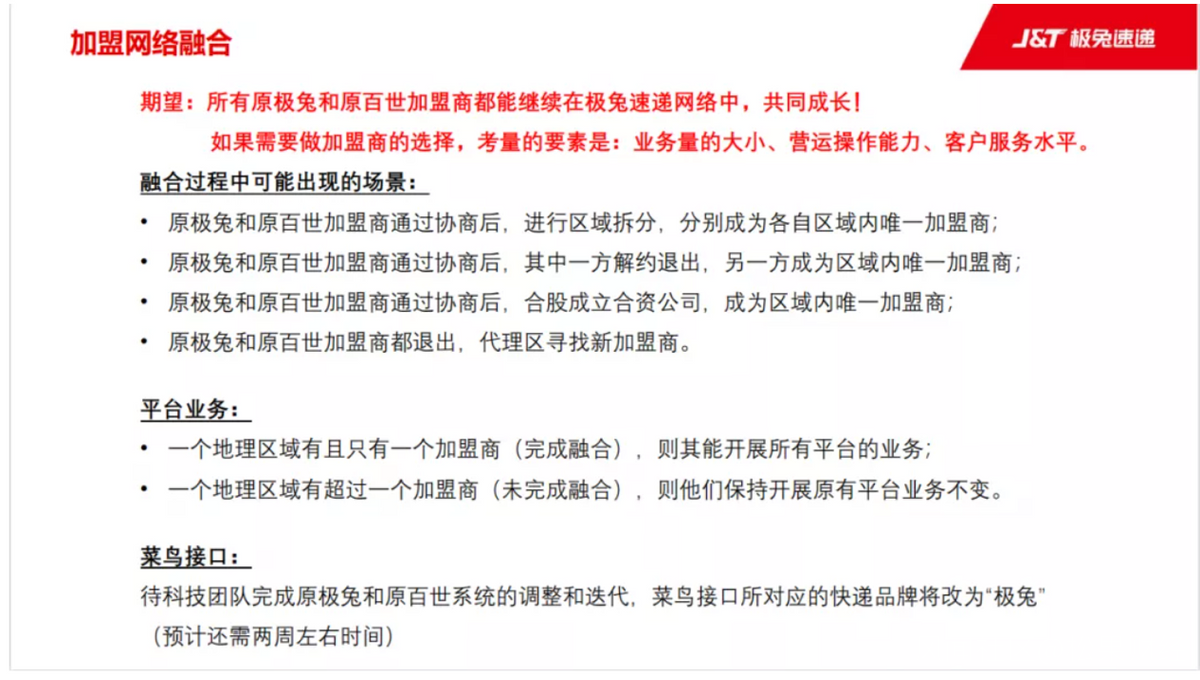 有關極兔、百世具體的融合方案,在一張網絡熱傳的融合方案裏,極兔先給加盟商吃了一顆“定心丸”。基於希望大家都能夠留下的初衷,針對同一區域雙方的加盟商,提供四種場景和解決方案,原則上是希望雙方加盟商都能夠繼續經營。如果不可避免出現二選一的情況,相信極兔也會提供較為公平的競爭機制,考核標準從業務量的大小、營運操作能力、客户服務水平三個維度來評定。