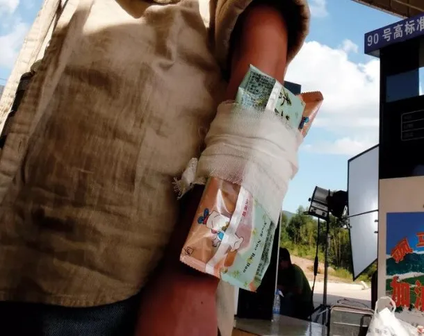 結果颳得狠了直接腫起來,現場找不到冰袋,就買根冰棍綁在胳膊上消腫。
