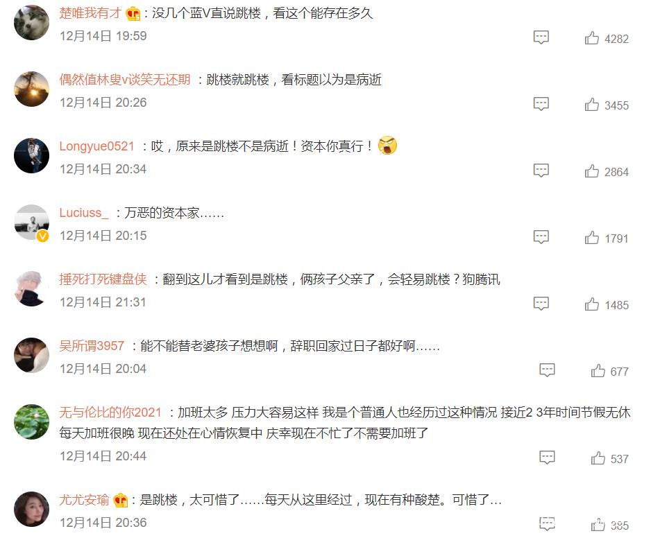大河報是所有藍V官媒中,罕見的直接用“騰訊遊戲開發大神毛星雲跳樓”為標題的。此外,對時間稍微敏感的就能看到,12月11日上午,那是週六的上午啊。這説明,毛星雲生前,週六還在公司加班
