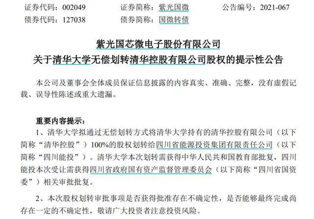清華控股將被無償劃轉給四川能投,附送的還有清華控股旗下八家上市公司,同方股份(600100.SH)、辰安科技(300523.SZ)、誠志股份(000990.SZ)、紫光國微(002049.SZ)、紫光股份、啓迪環境(000826.SZ)、學大教育(000526.SZ)、微芯生物等。