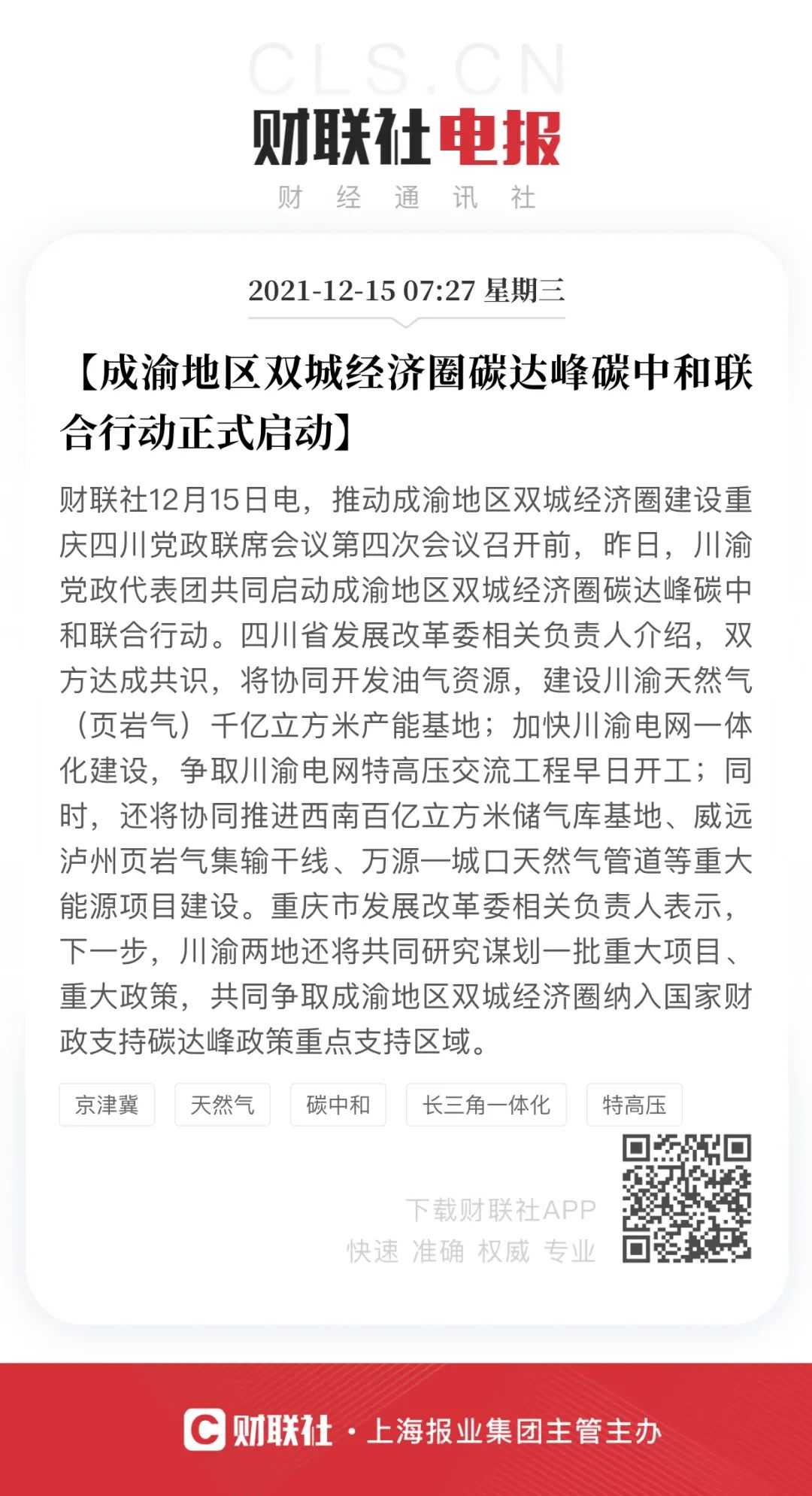 就在昨天(12月14日),成渝地區雙城經濟圈碳達峯碳中和聯合行動正式啓動,雙方將協同開發油氣資源,推進川渝天然氣(頁岩氣)千億立方米產能基地,西南百億立方米儲氣庫基地等重大能源項目,共同爭取成渝地區雙城經濟圈納入國家財政支持碳達峯政策重點支持區域。