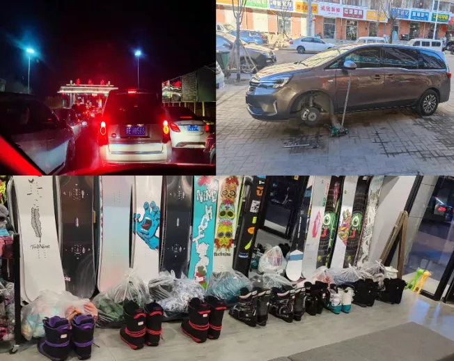 這趟三天兩夜的自駕遊算不上一帆風順:先是出發前得知凡是身份證號歸屬區為“北京市海淀區”的遊客都會在當地被遣返,一名同事只好因此放棄旅程;再就是路程消耗的時間遠遠大於預期,到達崇禮小鎮時已經是凌晨,飢腸轆轆的大家只有幾小時休息時間;第二天進入雪場時,一位同事發現自己租的雪靴不翼而飛;而在第三天返程時,我們又發現自己的車胎被紮了,上演“生死時速”,在氣漏完之前趕到汽修店……