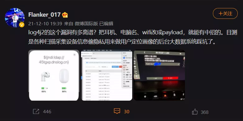“ 上百萬刀的安全架構,在 Log4J2 漏洞面前一文不值。。。 ” ▼