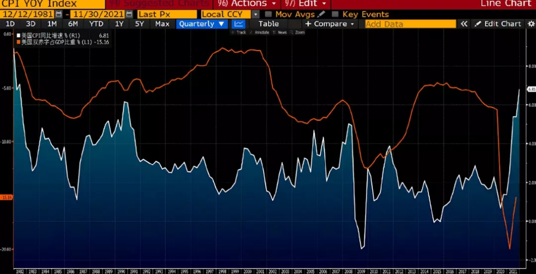 白線為美國CPI月度同比增幅,紅線為美國雙赤字佔GDP比重