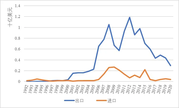 圖2:中國石油天然氣鑽機的國際貿易額,1992-2020