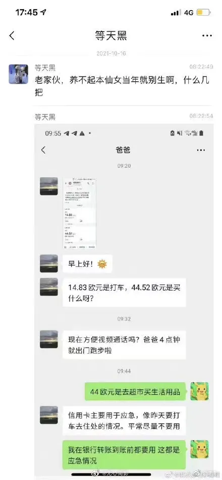 有一天憤怒的留學生在論壇發帖,發佈她和老爸的聊天截圖,稱,“老傢伙,養不起本仙女當年就別生啊……”