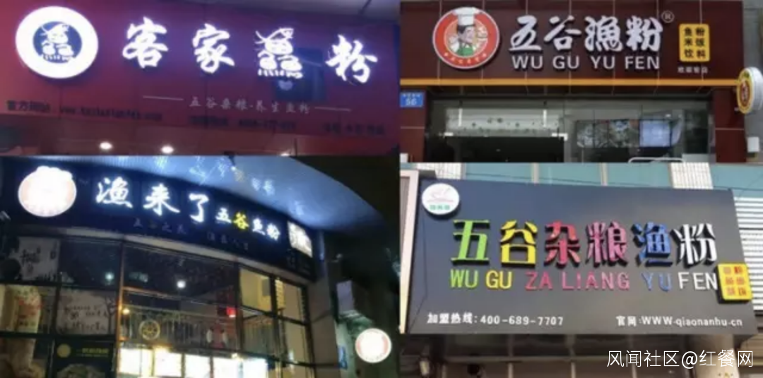 另外,從品類角度看,前文我們也有提到,很多魚粉品牌的出現都是受到“五穀漁粉”品牌的影響,但縱觀的魚粉市場,很多餐飲創業者都有着同樣的品類認知障礙,他們將“五穀漁粉”品牌等同於品類,很多魚粉品牌都在品牌名字上帶上了“五穀漁粉”“五穀魚粉”四個大字。