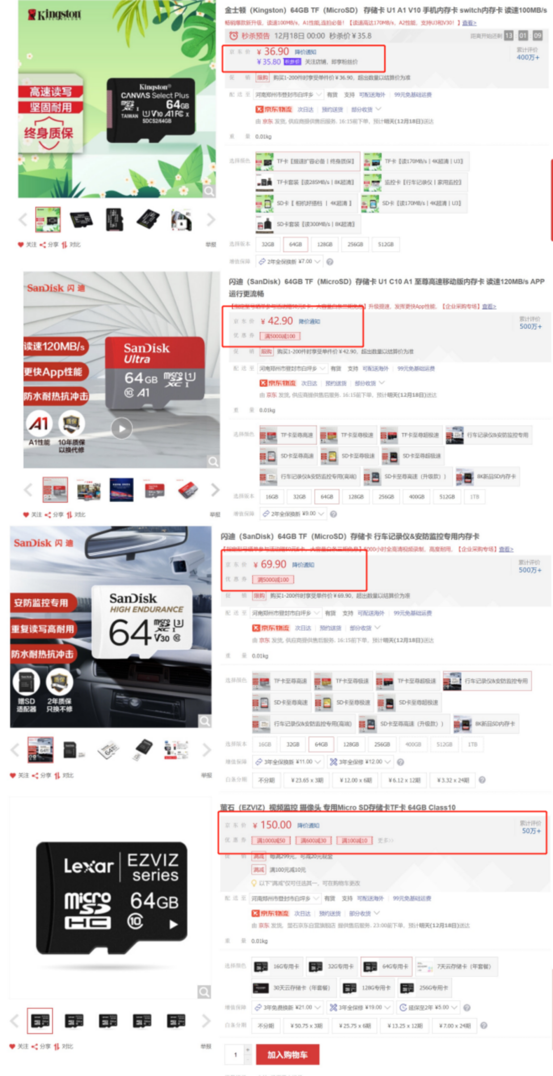 在某電商平台搜索便可發現,同樣的64G TF存儲卡,諸如金士頓、閃迪等知名大廠的產品售價也不過70元,而螢石網絡的TF存儲卡售價卻高達150元。