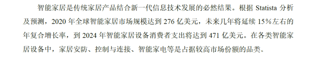相關數據顯示,2015年全球消費者在智能家居產品和服務上的支出約50億美元。5年來,智能家居行業發展迅速,根據螢石招股書中所列數據“根據Statista分析及預測,2020年全球智能家居市場規模達到276億美元”。