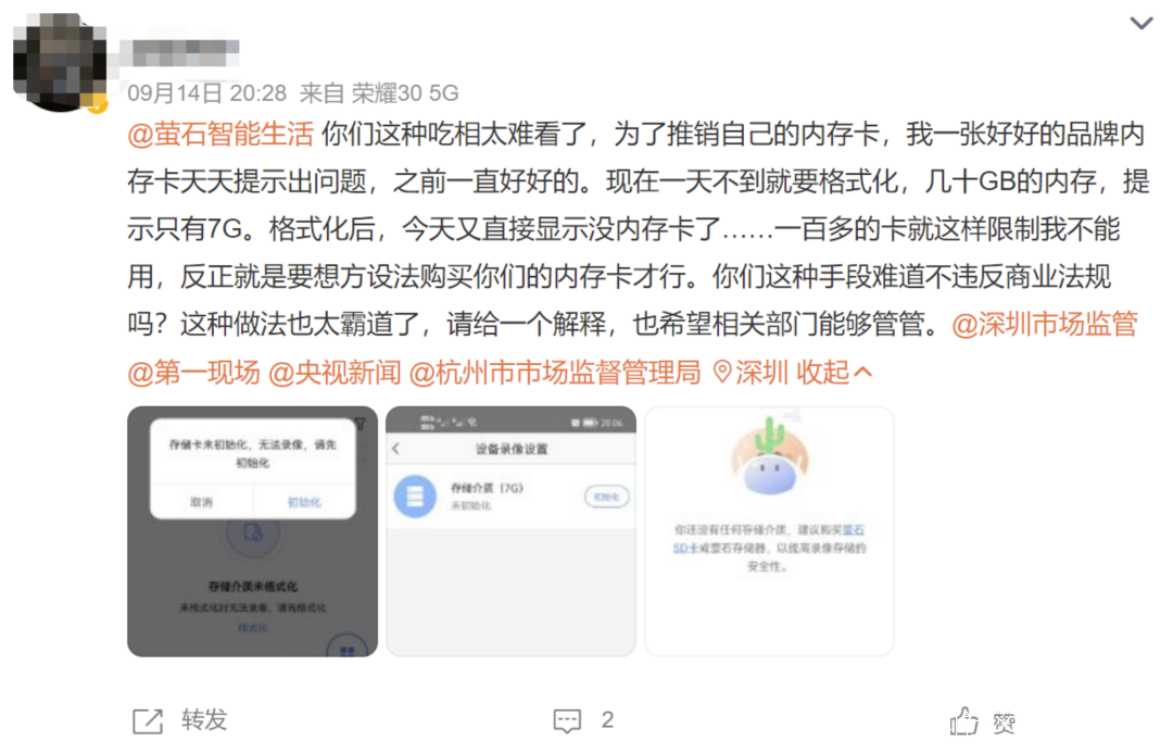 社交媒體上也有消費者吐槽過類似問題,甚至有網友懷疑是螢石網絡故意設置門檻,以便銷售其售價明顯高於市場價的存儲卡。