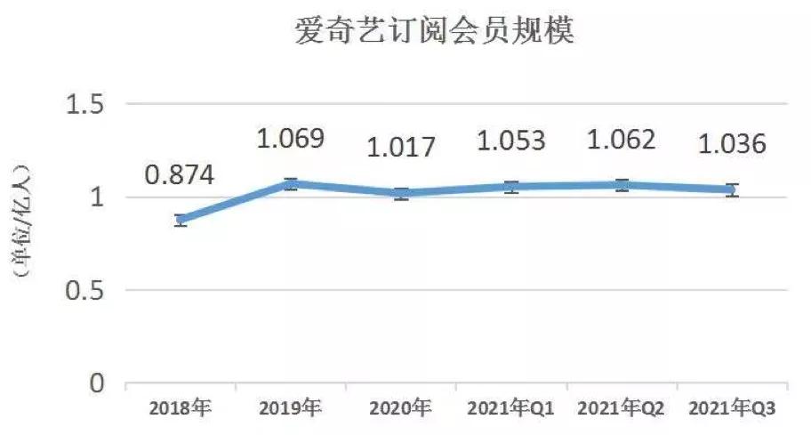 此外,該項收入對應會員規模。截至2021年三季度末,愛奇藝訂閲會員規模達1.036億,較二季度末的1.062億減少260萬。而在一季度末,其會員總數為1.053億。