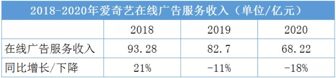 作為第二大貢獻業績的業務,2020年,愛奇藝從在線廣告中獲得收入達68.22億元,同比下降18%。而在2019年,該收入較上年同期下降11%。