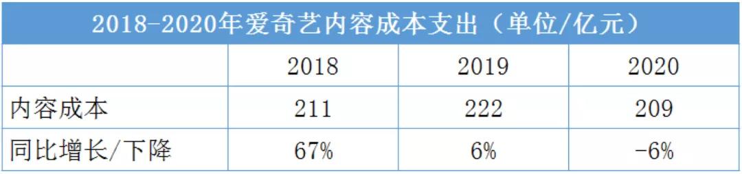 2018年至2020年,愛奇藝在內容上花費成本為211億元、222億元、209億元,對應同期營業收入分別為249.9億元、289.9億元、297.1億元。