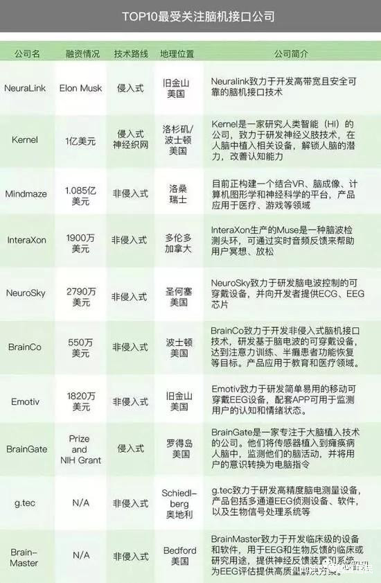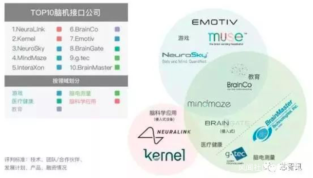 根據第三方研究機構對於目前的腦機接口公司,通過對於公司的技術、團隊/合作伙伴、發展計劃、產品、融資情況這五個維度,評出了世界十大最受關注腦機接口公司。