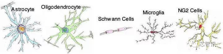 事實上大腦裏面還有一種叫做膠質細胞(glial cell)的東西,這種細胞有許多不同的變種,分別負責不同的功能,比如清掃釋放到突觸內的化學物質,用髓鞘包裹軸突,以及作為大腦的免疫系統。下面是一些常見的神經膠質細胞種類:
