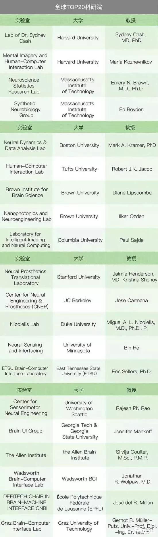 當然,除了這20大科研院所外,還有美國國防高級研究計劃局DARPA及Facebook的Building 8等課題組在從事腦機接口方面的研究。