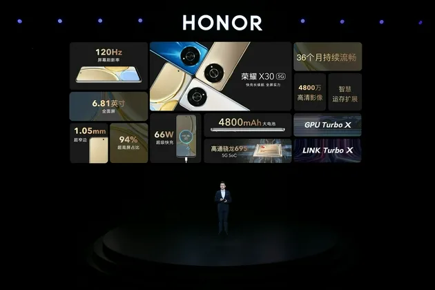 榮耀發佈X30系列,配備6.81英寸120Hz屏幕,芯片為驍龍695處理器,後置4800萬像素主攝+200萬像素景深鏡頭+200萬像素微距鏡頭,配置4800毫安電池,支持66W快充,售價1499元起。同時,榮耀發佈暢玩30Plus,搭載6.74英寸90Hz屏幕,支持22.5W快充,5000毫安電池,售價1299元起。