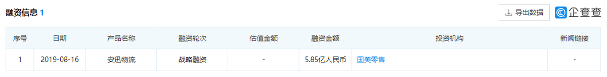 再融資歷程方面,安迅物流在2019年8月16日獲得由國美零售投資的5.85億元戰略融資。
