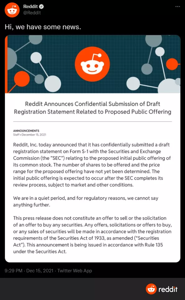當地時間週三,以“美國散户大本營”著稱、擁有WallStreetBets等知名論壇的社交媒體公司Reddit宣佈,已向SEC秘密提交了IPO申請。發行股數和價格區間尚未確定。