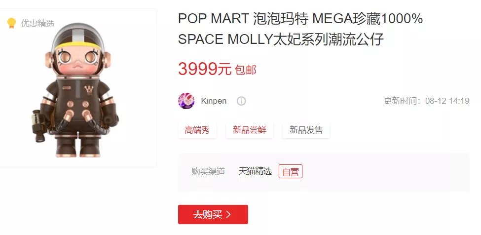 這個Molly 可不得了,2016年7月,泡泡瑪特天貓官方旗艦店裏,僅僅上線4秒鐘,200套價值708元的Molly就全部售罄了。